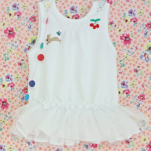 An elegant addition to their wardrobe, this embroidered top will keep them looking cute. It has been lovingly crafted from pure cotton and is kind to sensitive skin. A versatile piece, it can be worn with jeans and trainers or a skirt and pumps. Finished with an embroidered rabbit & cherry at the chest and tutu net at the hem.